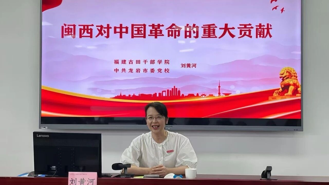 福建古田干部学院党委委员、副院长,龙岩市委党校副校长刘黄河,以《闽西对中国革命的重大贡献》为题开展专题教学。她以鲜活的历史事件为脉络,用生动、通俗的语言从闽西是中国革命重要基地、闽西苏区建设创新与示范、毛泽东思想在闽西的孕育及闽西是“红旗不倒”的典范等几个方面详细讲述了闽西老区在革命历程中的关键作用。一个个感人故事中,学员们党性修养再强化,对“思想建党”的意义有了更深理解。