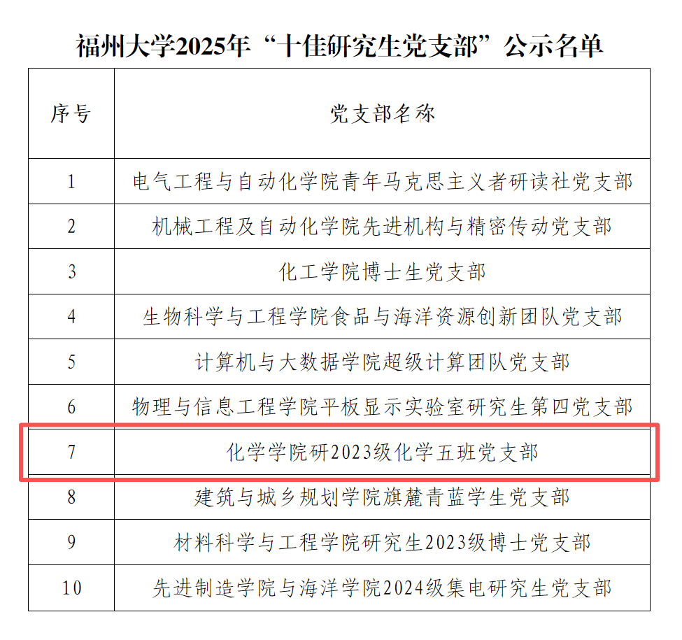 近日,福州大学2025年“十佳研究生党支部”评选结果正式公布,化学学院研2023级化学五班党支部获评。