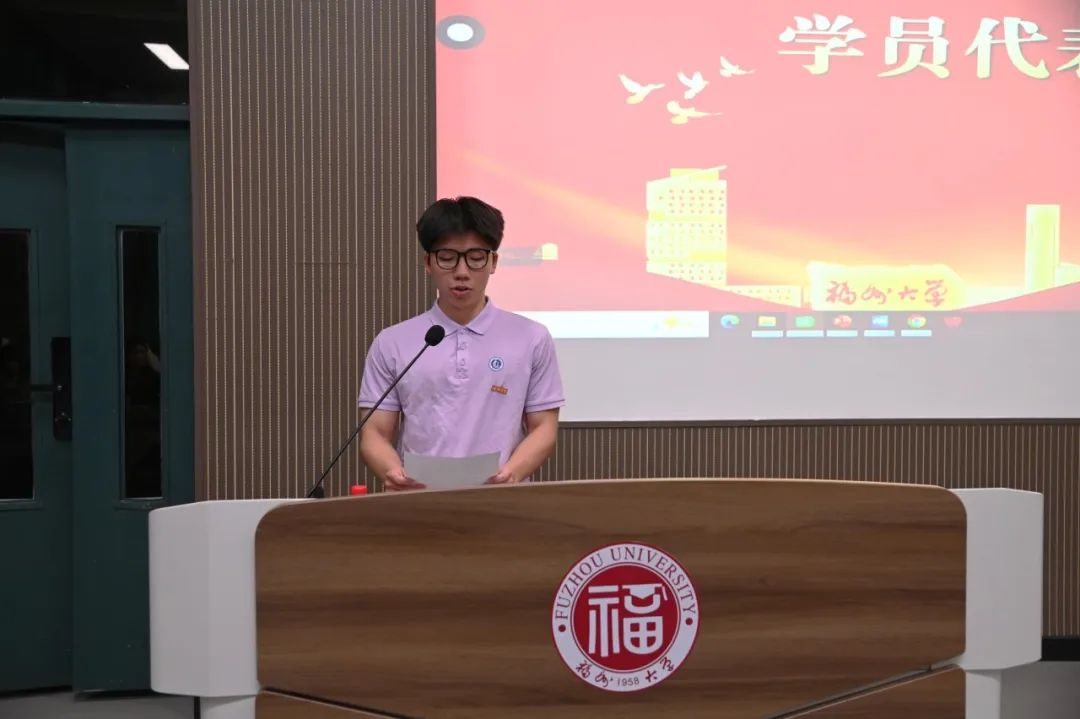 2025级硕士研究生蔡宇宁作为学员代表发言。他表示将以此次培训作为崭新起点,锤炼品格,勇担重任,努力在实现中华民族伟大复兴的征程中,贡献属于福大化学人的青春智慧和力量。