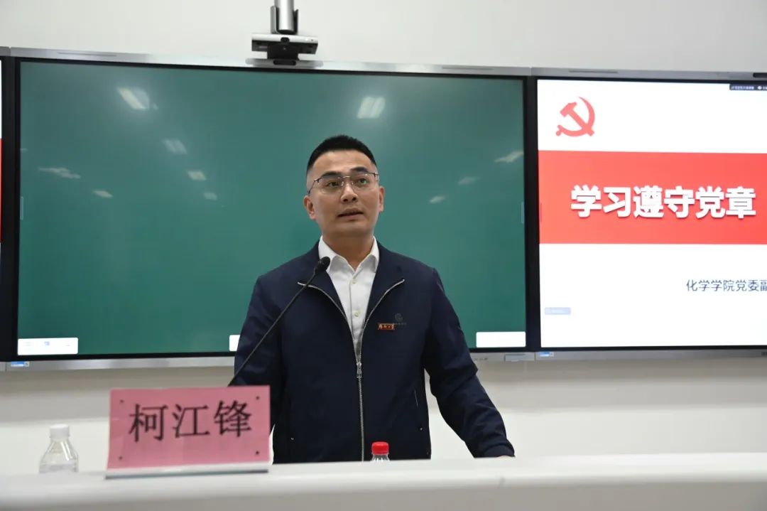 化学学院党委副书记柯江锋系统回顾了党章演进历程中的六大里程碑,强调党章作为党的根本大法意义重大,引导同学们深化对党的性质、宗旨及党员权利义务的认识,激励大家胸怀天下、务实笃行,在讲好时代故事、不懈奋斗中践行初心使命。