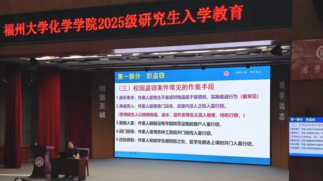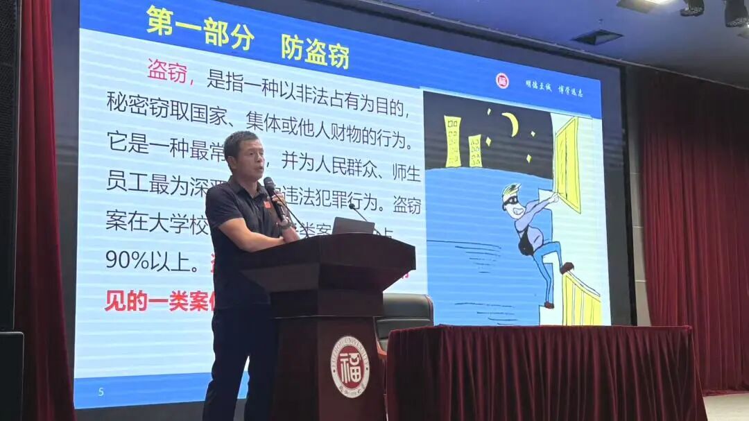 福州大学校保卫部林礼文老师作了题为《校园安全与网络安全防范》的专题讲座。林礼文老师结合自身工作经验与典型案例,向同学们普及了消防安全、交通安全等知识并传授识别、防范诈骗的实用技巧,引导同学们提高安全防范意识。