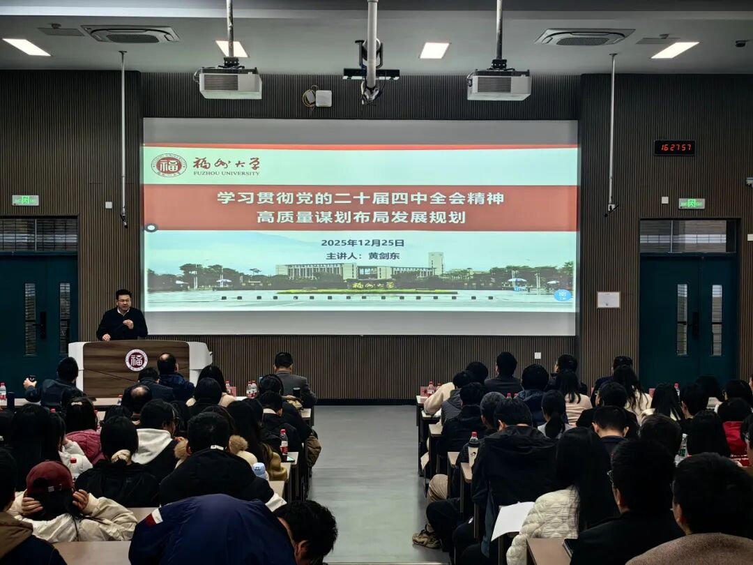12月25日,化学学院党委、医学院党委联合举办的学习贯彻党的二十届四中全会精神宣讲报告会在福州大学旗山校区举行。会议特邀宣讲团成员、医学院执行院长兼研究生院常务副院长黄剑东教授作宣讲报告,两院师生党员代表参会。