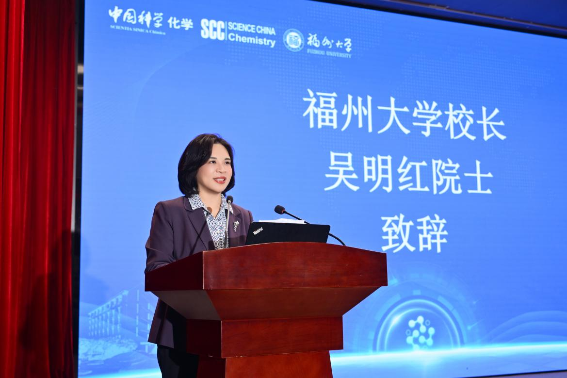 万立骏院士代表期刊编委会并致辞。他介绍了《中国科学:化学》的办刊理念与发展情况,希望本次论坛能成为促进学术交流与人才培育的重要纽带。校长吴明红院士向全体参会专家学者致以诚挚欢迎,并简要介绍了福州大学的发展历史和建设成就,特别是学科建设情况,她表示,期待论坛为相关学科的创新突破注入新动能。《中国科学:化学》编辑部主任张学梅博士围绕期刊建设,详细介绍了中英文刊物的发展现状,指出近年来期刊出版规模显著扩容,学术影响力实现大幅跃升。