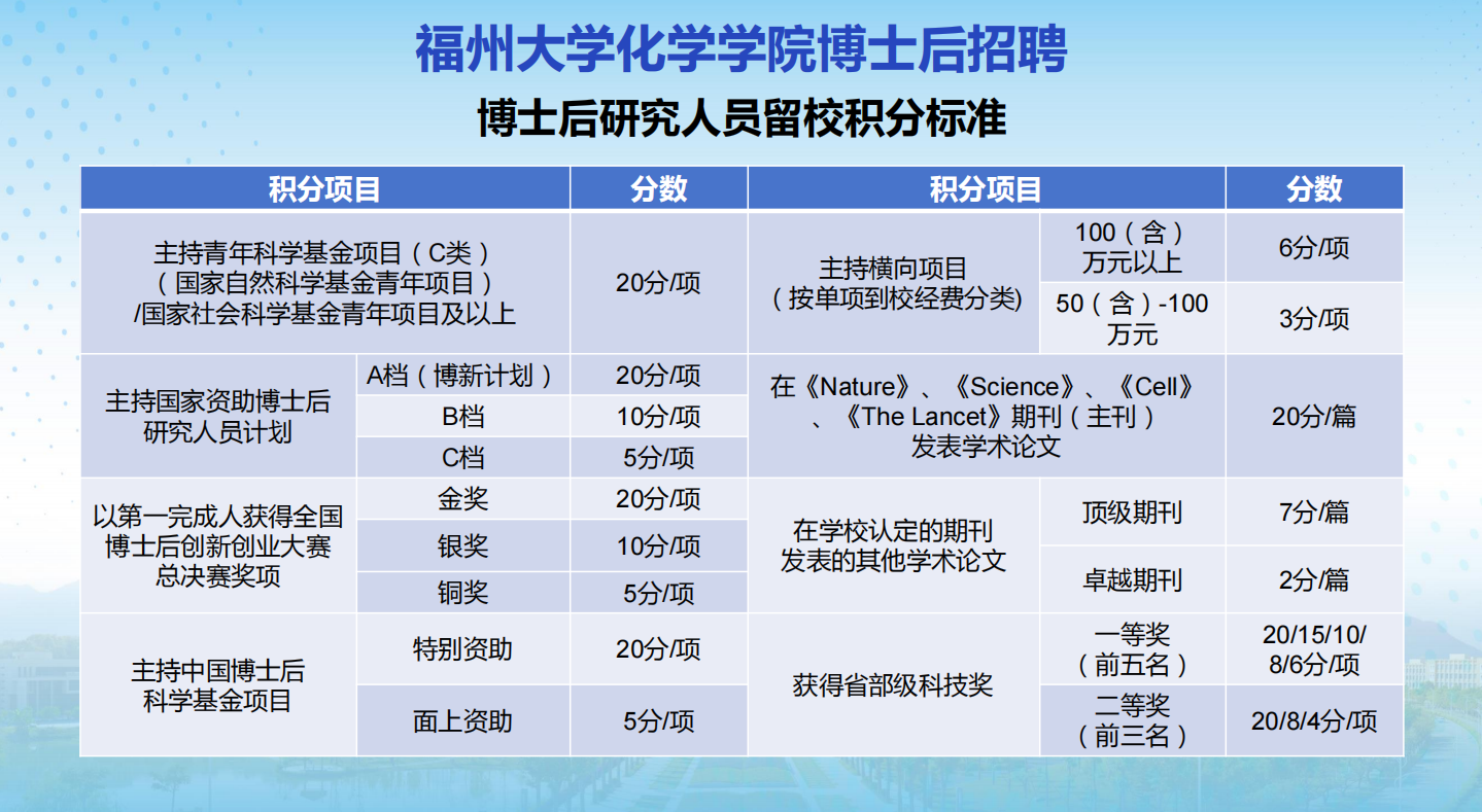 2.常规全职博士后:满足条件可申请转为师资博士后,出站积分满20分可申请留校,一次性发放科研绩效10万元