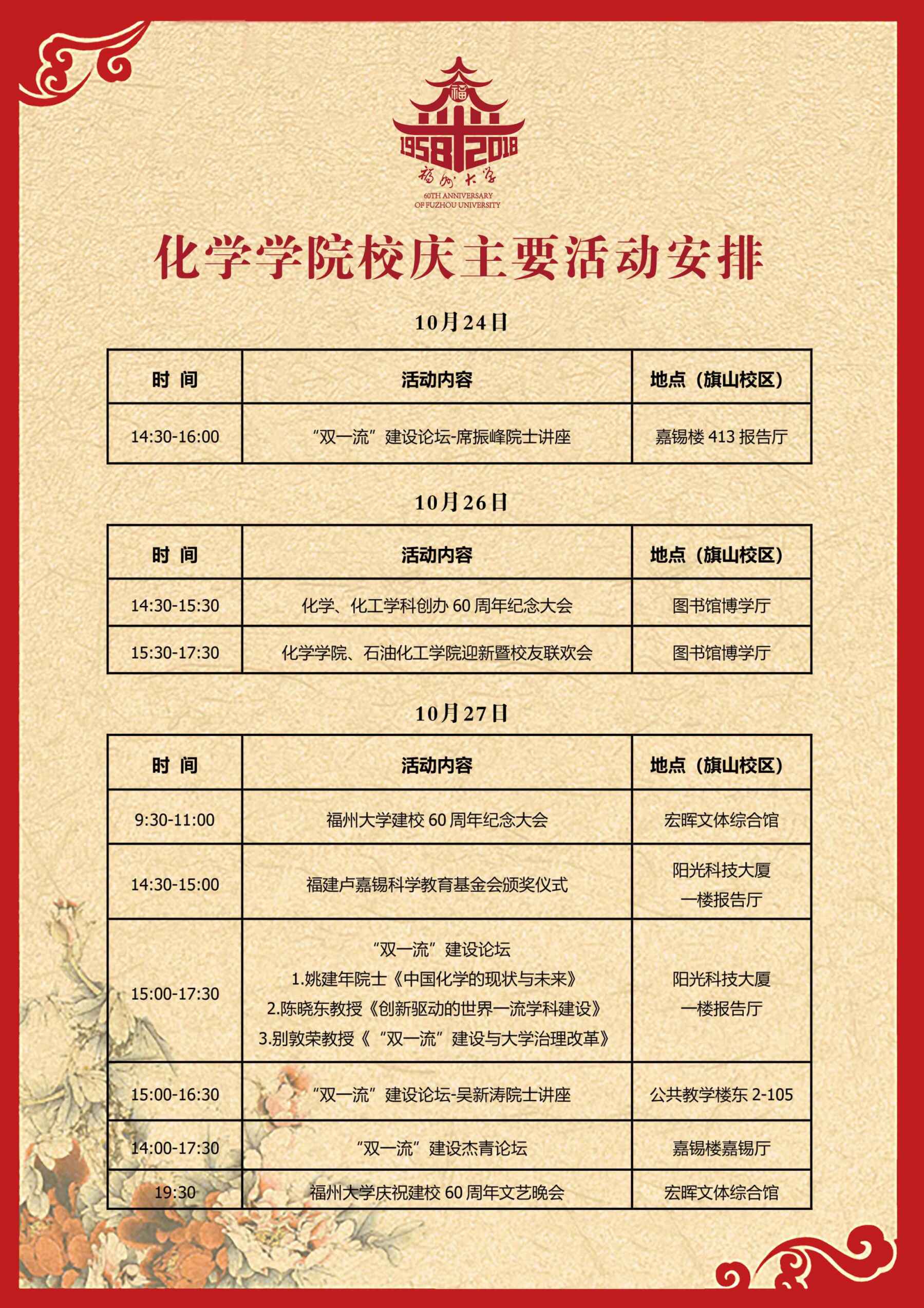 化学学院正按照福州大学确立的走区域特色创业型强校之路的办学理念,按照建设世界一流学科高水平研究型学院的目标而努力。!60周年校庆是学校办学发展的重要里程碑,也是学院凝心聚力、推进发展的崭新起点。为总结办学经验,汇聚各界力量,共谱发展新篇,学校于2018年10月26日下午14:30在旗山校区图书馆博学厅举行庆祝化学、化工学科创办60周年纪念大会,27日承办福州大学双一流建设论坛系列学术、交流活动。诚挚邀请学院全体师生同襄盛举,日程安排详见附件。