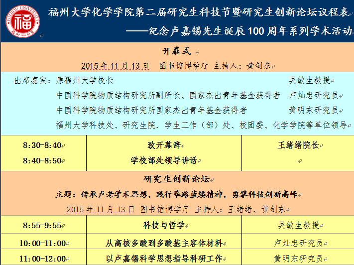 为纪念卢嘉锡先生诞辰100周年,加强研究生的创新能力培养,学院将举办第二届化学学院研究生科技节暨研究生创新论坛,设有“研究生创新论坛”、“硕博学术沙龙”、“博思讲坛”、演讲比赛等活动内容。第二届化学学院研究生科技节暨研究生创新论坛开幕式将于11月13日上午8:30在图书馆博学厅举行,特邀原福大校长吴敏生教授、中科院物质结构研究所副所长、国家杰青卢灿忠研究员、国家杰青黄明东研究员为我院师生讲学。开幕式要求全体研究生出席,欢迎各位老师参加。