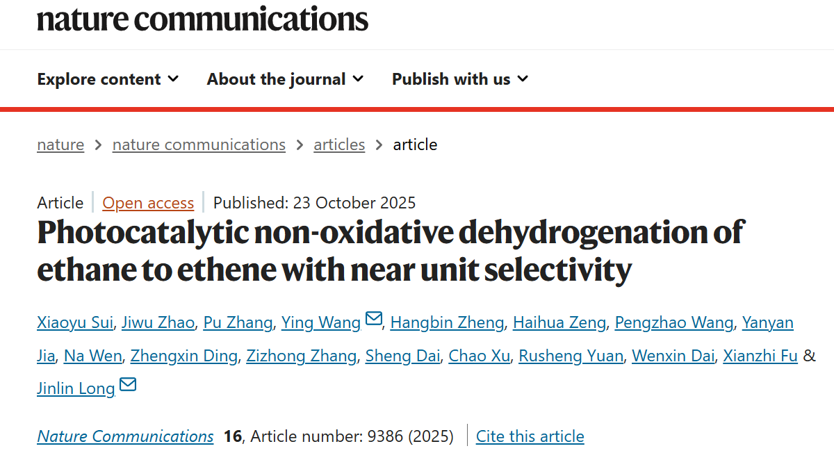 论文信息:Xiaoyu Sui‡, Jiwu Zhao‡, Pu Zhang‡, Ying Wang*, Hangbin Zheng, Haihua Zeng, Pengzhao Wang, Yanyan Jia, Na Wen, Zhengxin Ding, Zizhong Zhang, Sheng Dai, Chao Xu, Rusheng Yuan, Wenxin Dai, Xianzhi Fu, Jinlin Long*. Photocatalytic non-oxidative dehydrogenation of ethane to ethene with near unit selectivity. Nat. Commun. 16, 9386 (2025). DOI:10.1038/s41467-025-64389-9