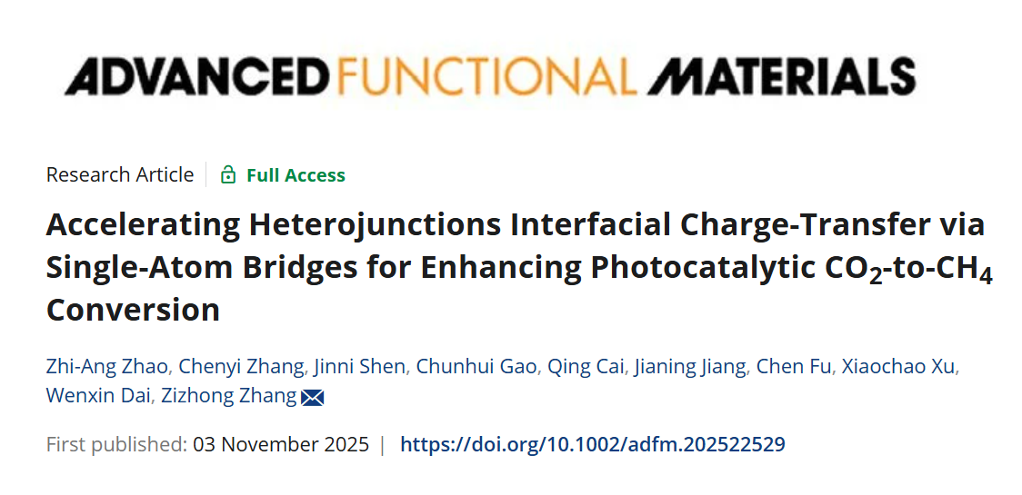 论文信息:Zhi-Ang Zhao, Chenyi Zhang, Jinni Shen, Chunhui Gao, Qing Cai, Jianing Jiang, Chen Fu, Xiaochao Xu, Wenxin Dai, Zizhong Zhang,Accelerating Heterojunctions Interfacial Charge-Transfer via Single-Atom Bridges for Enhancing Photocatalytic CO2-to-CH4 Conversion,Adv. Funct. Mater., 2025, e22529,DOI:10.1002/adfm.202522529.