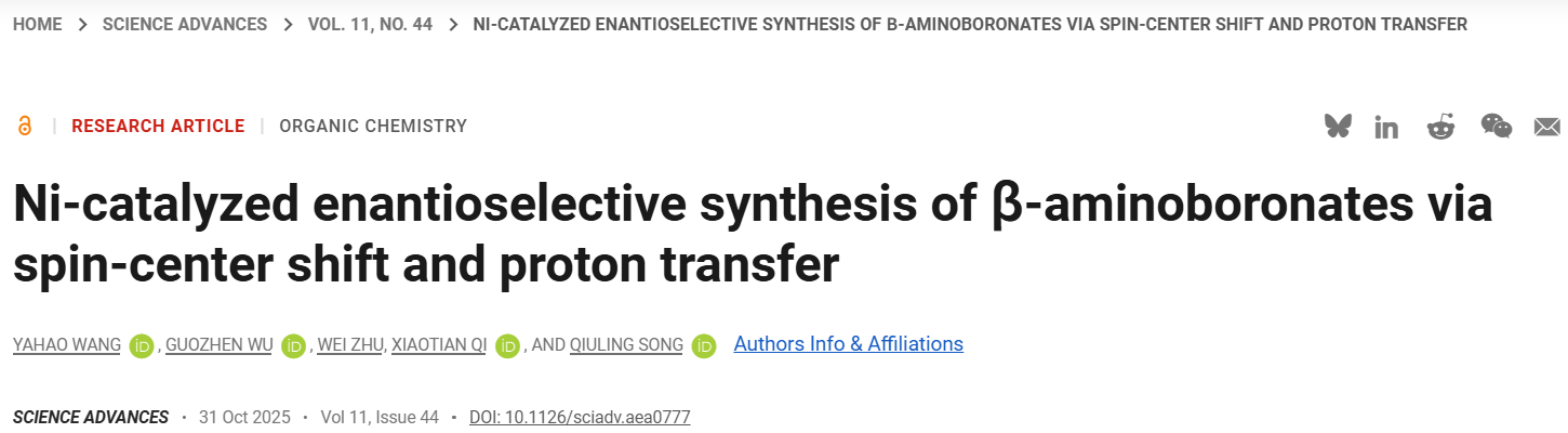 近日,我院宋秋玲教授课题组在国际权威期刊Science Advances上发表题为“Ni-catalyzed enantioselective synthesis of β-aminoboronates via spin-center shift and proton transfer”的研究成果。该研究发展了一种镍催化的还原偶联策略,实现β-胺基硼酸酯的对映选择性合成。