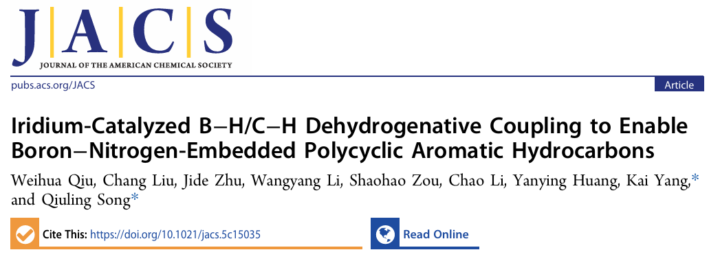 近日,我院宋秋玲教授课题组在国际权威期刊Journal of the American Chemical Society上发表题为“Iridium-Catalyzed B-H/C-H Dehydrogenative Coupling to Enable Boron-Nitrogen-Embedded Polycyclic Aromatic Hydrocarbons”的研究成果。该研究发展了一种铱催化的C-H/B-H脱氢偶联策略,实现2,1-硼氮杂环硼位点精准外围官能团化,有效拓展了其π共轭体系。