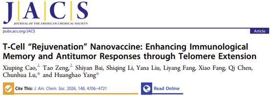 论文信息:“T Cell “Rejuvenation” Nanovaccine: Enhancing Immunological Memory and Anti-Tumor Responses through Telomere Extension”, Xiuping Cao, Tao Zeng, Shiyan Bai, Shiqing Li, Yana Liu, Liyang Fang, Xiao Fang, Qi Chen, Chunhua Lu, and Huanghao Yang. J. Am. Chem. Soc. 2026, 148, 4706-4721