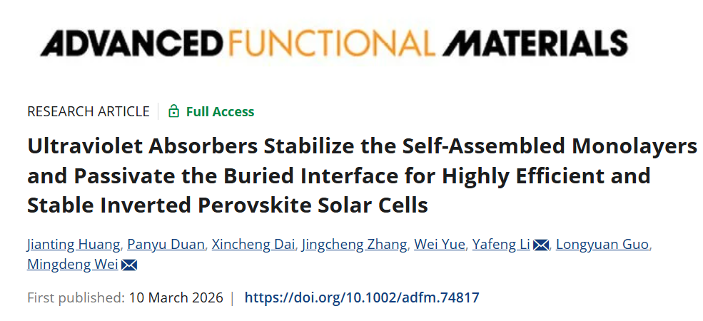 论文信息:Ultraviolet Absorbers Stabilize the Self‐Assembled Monolayers and Passivate the Buried Interface for Highly Efficient and Stable Inverted Perovskite Solar Cells, Jianting Huang, Panyu Duan, Xincheng Dai, Jingcheng Zhang, Wei Yue, Yafeng Li*, Longyuan Guo, Mingdeng Wei*, Advanced Functional Materials, 2026, e74817.