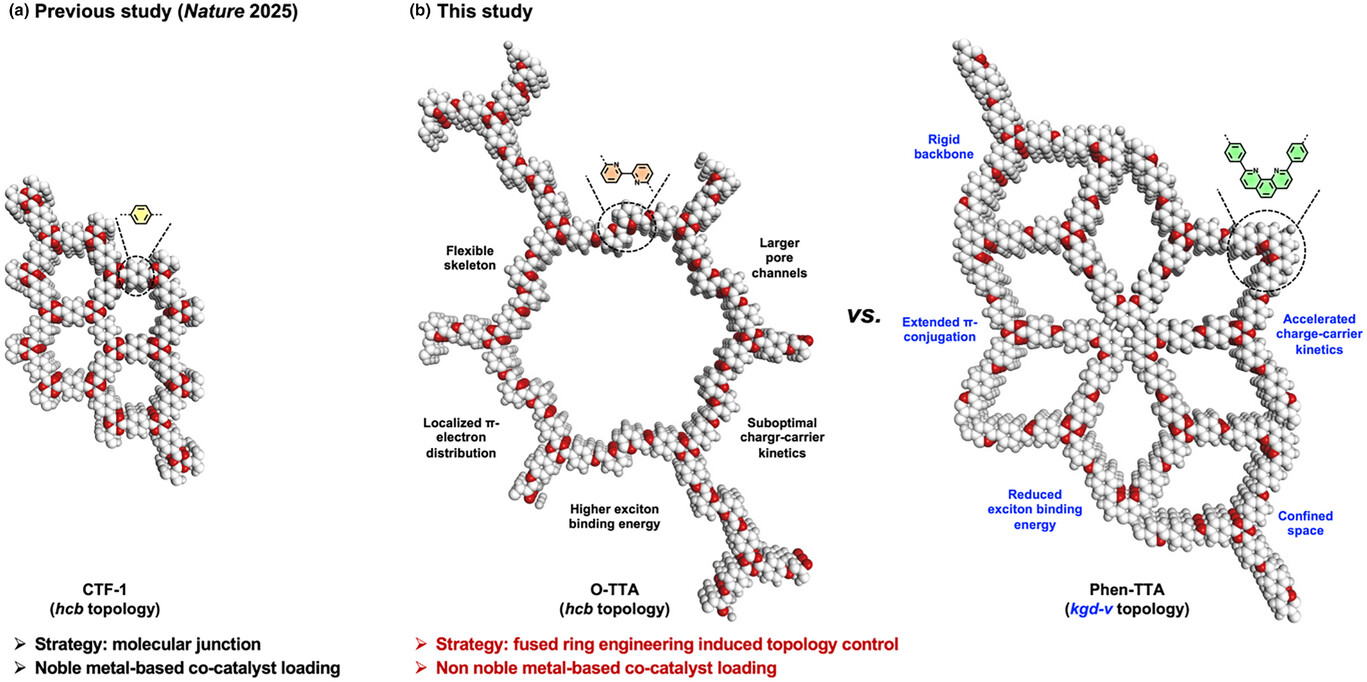 2026年4月13日,我院陈雄研究员、邢万东副教授与香港大学郭正晓教授团队合作,在《Angewandte Chemie International Edition》在线发表了题为“Fused Ring Engineering Induced Topology Control in Covalent Organic Frameworks: Unlocking Promoted Photocatalytic H2O2 Production and Selective Methane Oxidation”的研究论文。该工作通过精准调控共价有机框架(COFs)的拓扑结构,实现了高效光催化过氧化氢(H2O2)合成,并在无贵金属助催化剂参与的条件下,成功将甲烷选择性氧化为乙醇。