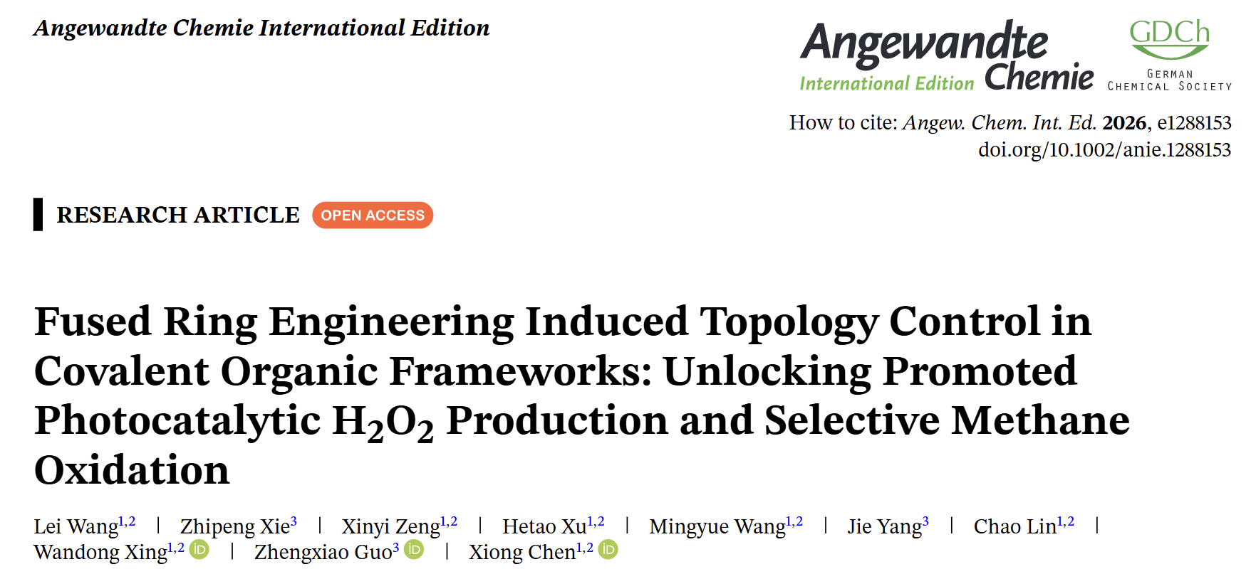 论文信息:“Fused Ring Engineering Induced Topology Control in Covalent Organic Frameworks: Unlocking Promoted Photocatalytic H2O2 Production and Selective Methane Oxidation”, Lei Wang, Zhipeng Xie, Xinyi Zeng, Hetao Xu, Mingyue Wang, Jie Yang, Chao Lin, Wandong Xing*, Zhengxiao Guo*, Xiong Chen*. Angewandte Chemie International Edition 2026, e1288153, DOI: 10.1002/anie.1288153