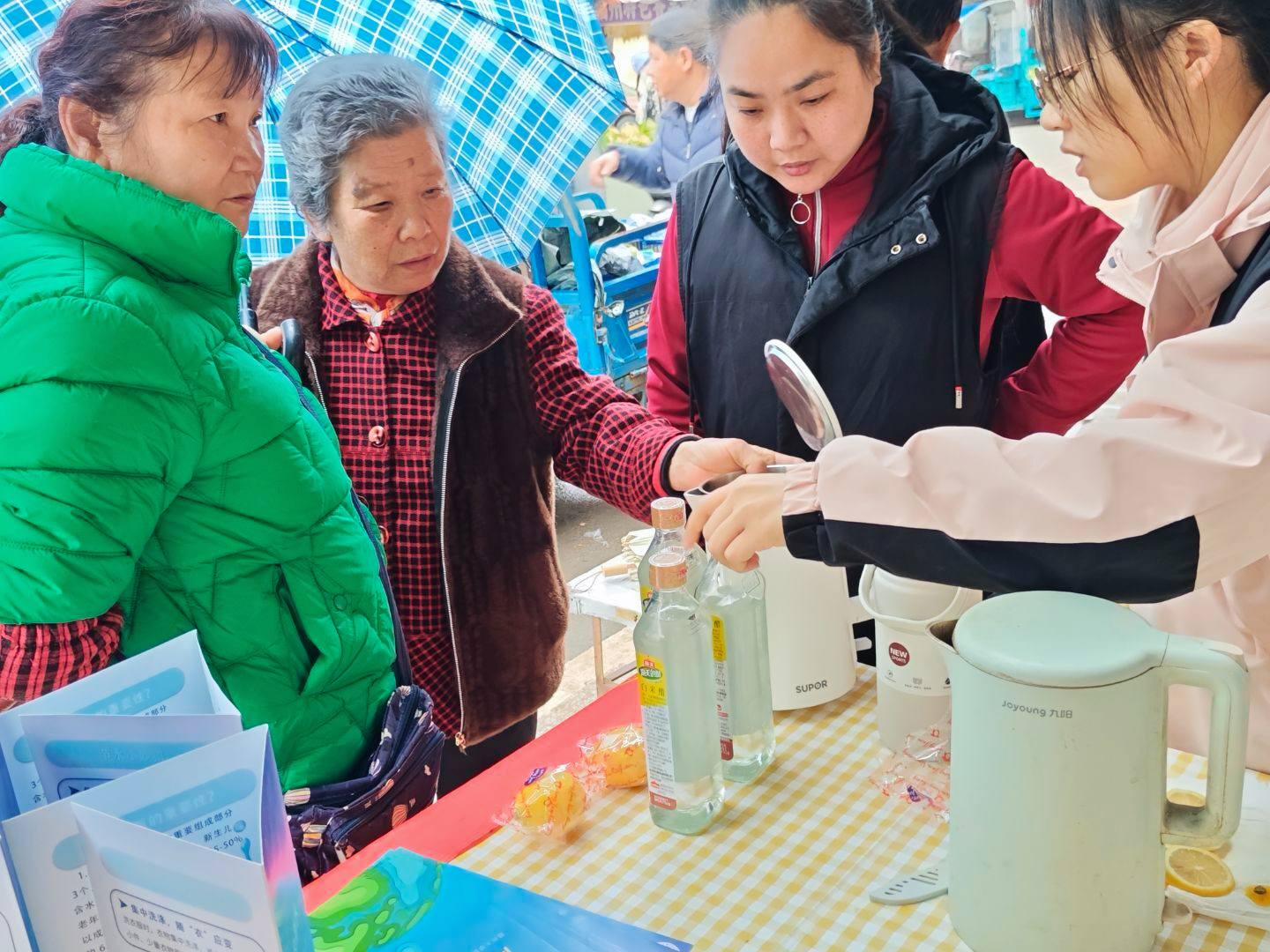 在居民们的支持下,志愿者们陆续收集到多个附着水垢的热水壶、保温杯等物品。大家迅速分工,投入细致专业的除垢工作中。