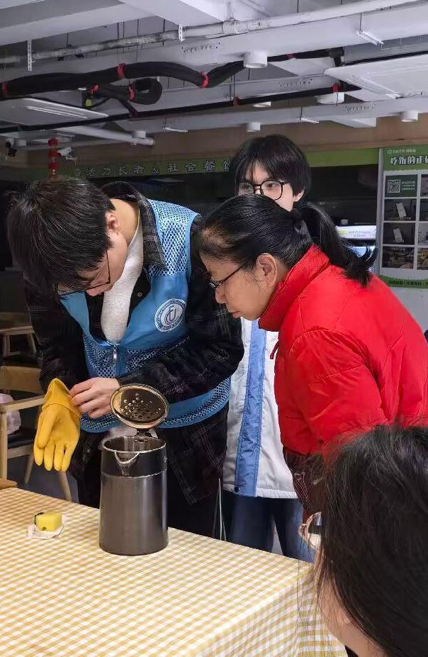 在志愿者们的宣传下,居民们陆陆续续带着沉积了水垢的锅和烧水壶来到长者食堂。志愿者们积极开展工作,为居民们讲解水垢的成因、危害,以及除水垢的原理,同时,利用所带的材料进行水垢清理。